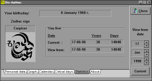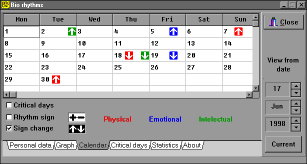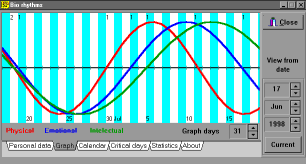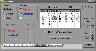 With Bio rhytms viewer you can: view graph of physical, emotional and intelectual bio cycles; bio calendar; search single, double and triple critical days; statistics and zodiacal sign.